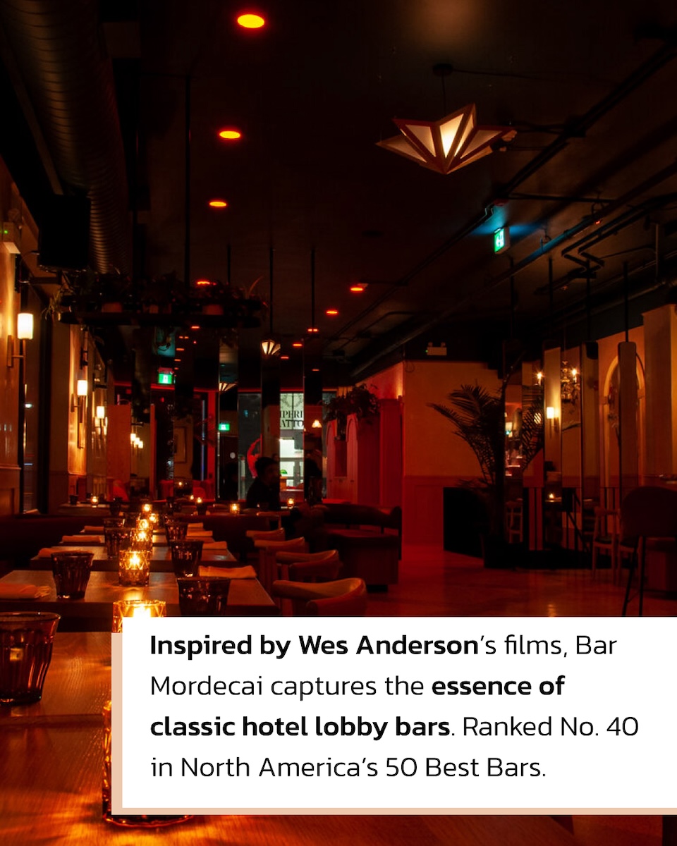 Inspired by the whimsical charm of Wes Anderson’s films, Bar Mordecai captures the timeless essence of classic hotel lobby bars. Ranked No. 40 in North America’s 50 Best Bars, this trendy Dundas Street West spot is a destination for both Instagrammers and serious cocktail enthusiasts.