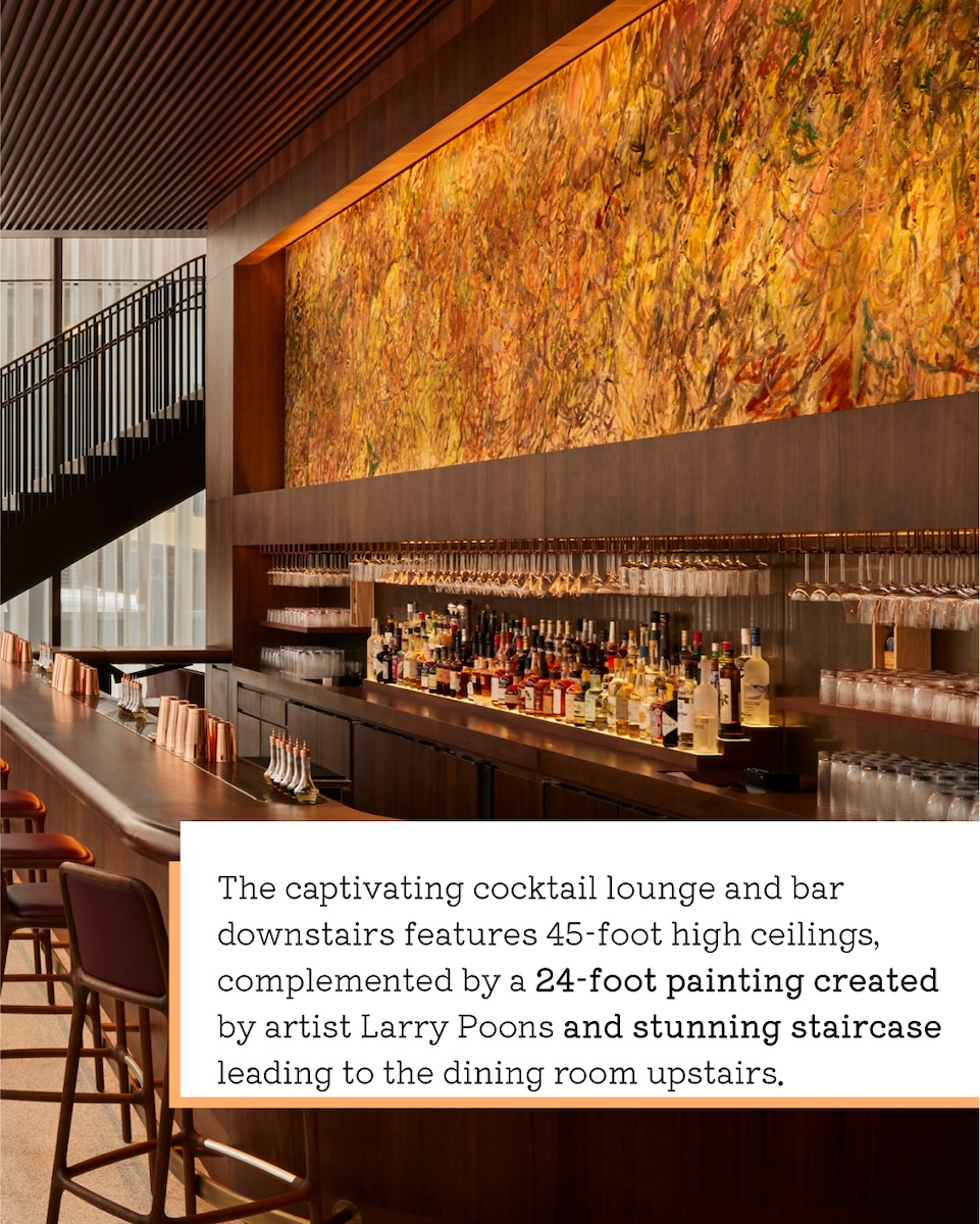 The lavish cocktail lounge and bar, located downstairs, features soaring 45-foot high ceilings, highlighted by a spectacular 24-foot painting by artist Larry Poons. The space exudes grandeur, making every visit unforgettable.